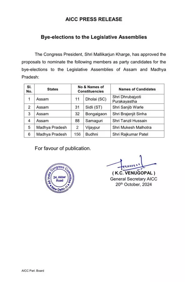 |मध्यप्रदेश में कांग्रेस पार्टी ने बुदनी-विजयपुर उपचुनाव के लिए दो उम्मीदवारों के नामों की घोषणा कर दी है। इसे लेकर कांग्रेस के अध्यक्ष मल्लिकार्जुन खड़गे ने नोटिस जारी किया है।