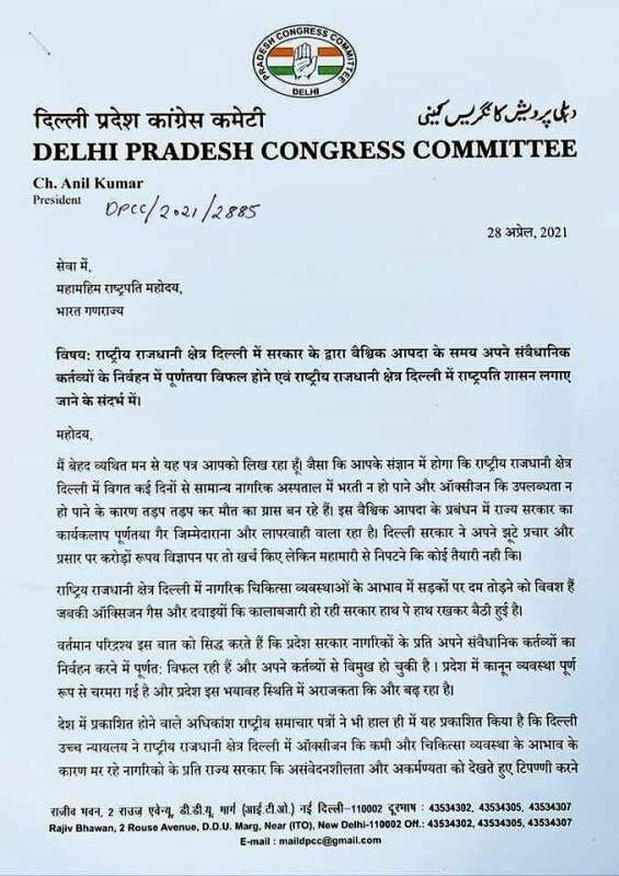 |नईदिल्ली। राष्ट्रीय राजधानी दिल्ली में कोरोना वायरस महामारी के बढ़ते खतरे के बीच प्रदेश कांग्रेस के अध्यक्ष चौधरी अनिल कुमार ने राष्ट्रपति राम नाथ कोविंद को पत्र लिखकर यहां राष्ट्रीय शासन लगाने की मांग की है। राष्ट्रपति के नाम गुरुवार को लिखे पत्र में चौधरी अनिल कुमार ने अरविंद केजरीवाल की अगुवाई वाली आम आदमी पार्टी सरकार पर कोरोना महामारी से निपटने में विफल रहने का आरोप लगाया है।