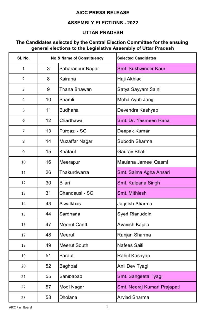 पश्चिमी उत्तर प्रदेश की 41 सीटों पर घोषित प्रत्याशियों में कांग्रेस ने पूनम पंडित समेत 16 महिलाओं को प्रत्याशी बनाया है। इससे पहले कांग्रेस ने 125 प्रत्याशियों की सूची जारी की थी। इसमें 50 महिलाओं को कांग्रेस ने प्रत्याशी बनाया था।कांग्रेस केन्द्रीय कार्यालय द्वारा जारी सूची में सहारनपुर नगर से सुखबिंदर कौर,कैराना से हाजी एखलाफ,थाना भवन से सत्यश्याम सैनी,शामली से मोहम्मद अयूब जंग, बुढ़ाना से देवेन्द्र कश्यप,चरथावल से डा.याशमीन राना और पुरकाजी सुरक्षित सीट से दीपक कुमार को प्रत्याशी बनाया है।
