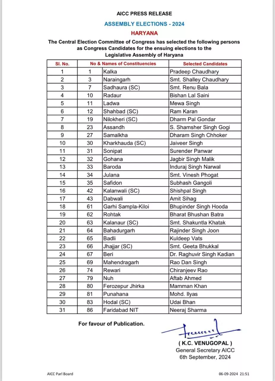 |Haryana Assembly Election Congress List : हरियाणा विधानसभा चुनाव के लिए कांग्रेस ने अपनी पहली सूची जारी कर दी है, जिसमें 31 प्रत्याशियों के नाम शामिल हैं। इस सूची में कई प्रमुख नेताओं और नए चेहरों को मौका दिया गया है। कांग्रेस ने जुलाना से मशहूर महिला पहलवान विनेश फोगाट को मैदान में उतारा है।