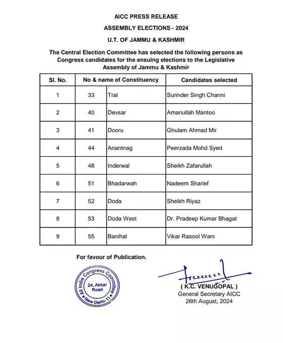 Congress Candidate List: जम्मू कश्मीर विधानसभा चुनाव के लिए कांग्रेस ने जारी की 9 उम्मीदवारों की सूची