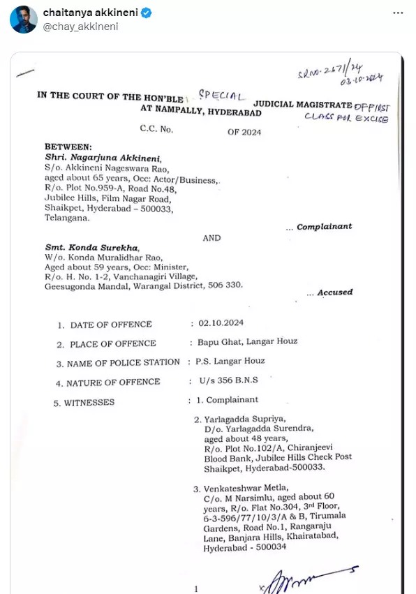 |Defamation Case filed against Minister Konda Surekha : सामंथा- नागा के तलाक पर बयान वापस लेने के बाद भी तेलंगाना की मंत्री कोंडा सुरेखा की मुश्किलें कम होने का नाम नहीं ले रहीं है। इस मामले में अब मंत्री सुरेखा के खिलाफ पुलिस ने मानहानि का मुक़दमा दर्ज कर लिया है। यह FIR एक्टर नागा चैतन्य के पिता अभिनेता नागार्जुन ने करवाई है। अभिनेता नागार्जुन द्वारा शिकायत कराने की जानकारी एक्टर नागा चैतन्य ने अपने सोशल मीडिया हैंडल से दी है। अभिनेता नागा चैतन्य ने अपने X हैंडल पर शिकायत की कॉपी पोस्ट की है।