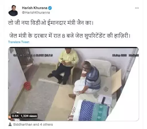 |नईदिल्ली। राजधानी दिल्ली की तिहाड़ जेल में मनी लॉन्ड्रिंग के मामले में बंद दिल्ली सरकार के मंत्री सत्येंद्र जैन का शनिवार को एक और वीडियो वायरल हुआ है। भाजपा प्रदेश प्रवक्ता हरीश खुराना ने कहा कि इस वीडियो में सत्येंद्र जैन, अपने कमरे में जेल सुपरिटेंडेंट अजीत कुमार समेत अन्य लोगों के साथ मीटिंग कर रहे हैं। जो कि सरासर जेल मैनुअल का उल्लंघन है। इससे पहले भी सत्येंद्र जैन की मसाज कराने और होटल का खाना खाने का वीडियो वायरल हुआ था। भाजपा का कहना है कि जेल में रहकर मंत्री सत्येंद्र जैन अपने प्रभाव का गलत इस्तेमाल कर रहे हैं।