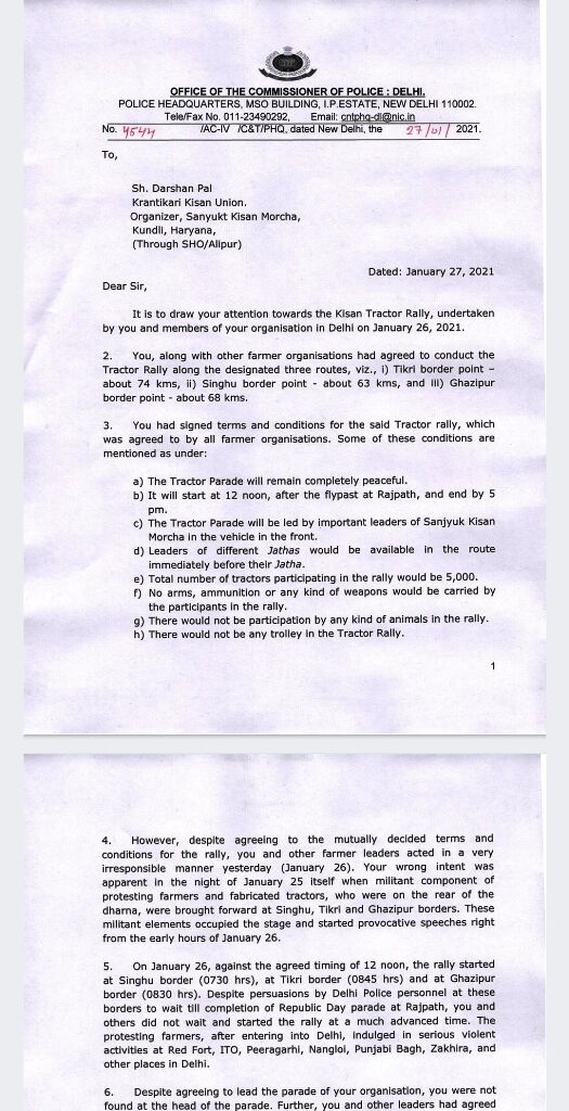 पुलिस की तरफ से भेजे गए नोटिस में कहा गया है कि क्रांतिकारी किसान यूनियन और अन्य संगठनों ने 26 जनवरी को ट्रैक्टर रैली निकाली थी। इसके लिए उन्होंने पुलिस को अंडरटेकिंग दी थी कि वह तय नियमों का पालन करेंगे। इसके लिए पुलिस द्वारा दिए गए रूट पर उन्होंने सहमति जताई थी। अंडरटेकिंग में उन्होंने हस्ताक्षर भी किया है। इसमें साफ लिखा गया था कि यह रैली शांतिपूर्ण तरीके से दोपहर 12 बजे से पांच बजे के बीच निकलेगी। संयुक्त किसान मोर्चा के नेता इसकी अगुवाई करेंगे। ट्रैक्टर रैली में केवल पांच हजार ट्रैक्टर शामिल होंगे और किसी के पास कोई हथियार नहीं होगा, लेकिन रैली में तय किये गए सभी नियमों की धज्जियां उड़ाई गईं।