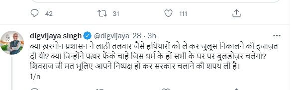 दरअसल पूर्व मुख्यमंत्री दिग्विजय सिंह ने रविवार को खरगोन में रामनवमी की शोभायात्रा के दौरान हुई हिंसा पर ट्वीट किया था, उन्होंने बिहार के एक फोटो को अपने ट्वीट में टैग करते हुए इसे खरगोन का बता दिया। इस फोटो में कुछ युवक मस्जिद में भगवा झण्डा लगा रहे हैं।