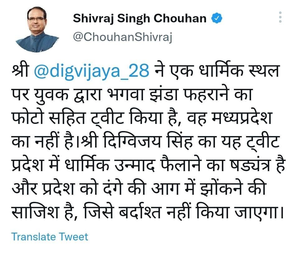 वहीं सीएम शिवराज ने भी दिग्विजय सिंह की आलोचना करते हुए ट्वीट लिखा कि दिग्विजय ने एक धार्मिक स्थल पर युवक द्वारा भगवा झंडा फहराने का फोटो सहित ट्वीट किया है, वह मध्यप्रदेश का नहीं है। दिग्विजय सिंह का यह ट्वीट प्रदेश में धार्मिक उन्माद फैलाने का षड्यंत्र है और प्रदेश को दंगे की आग में झोंकने की साजिश है, जिसे बर्दाश्त नहीं किया जाएगा।