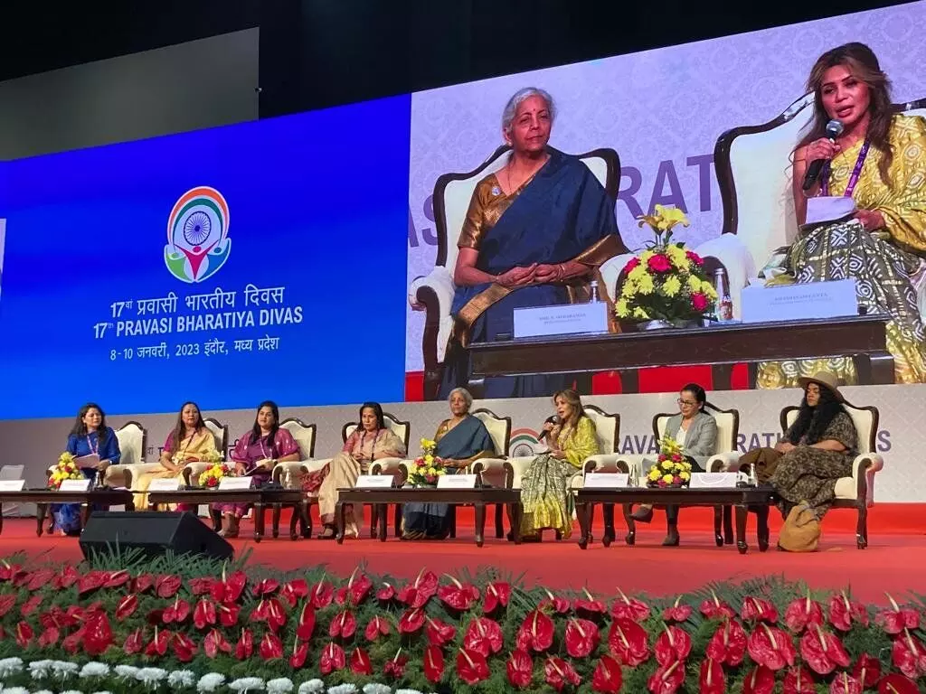 |इंदौर। भारत ने वर्ष 1990 के बाद बहुत तीव्र गति से प्रगति की है। वैश्विक मापदण्डों के अनुसार उत्पादन हो रहा है। अमृत काल के अगले 25 वर्ष में "फोर-आई"- इन्फ्रा-स्ट्रक्चर, इनवेस्टमेंट, इनोवेशन्स और इनक्लूजिव पर केन्द्रित प्रगति में प्रवासी भारतीय सक्रिय योगदान दें। केन्द्रीय वित्त मंत्री निर्मला सीतारमण ने यह आहवान आज प्रवासी भारतीय दिवस सम्मेलन के तीसरे दिन "हार्नेसिंग द पोटेंशियल ऑफ वुमन डायस्पोरा इंटरप्रेन्योर्स टूवर्डस एन इनक्लूजिव एप्रोच टू नेशन बिल्डिंग" सत्र की अध्यक्षता करते हुए किया। उन्होंने कहा कि आप भारतीय संस्कृति और भारत के ब्राण्ड एम्बेसडर हैं, जन-भागीदारी से भारत को उच्च शिखर पर ले जाने में सक्रिय योगदान दें। भारत वर्तमान और अगले साल का सबसे तेज गति से आर्थिक उन्नति करने वाला देश भी है।