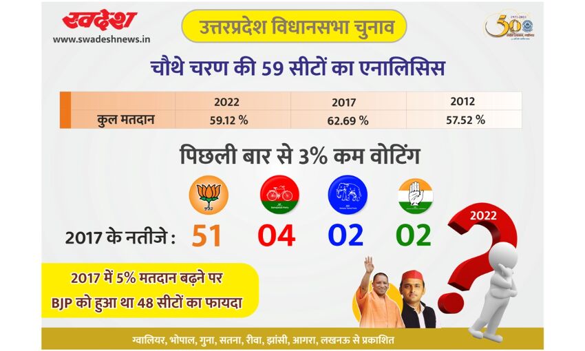 लखनऊ। उत्तर प्रदेश विधानसभा चुनाव में चतुर्थ चरण के नौ जिलों की 59 सीटों पर बुधवार शाम छह बजे मतदान समाप्त हो गया। शाम 8 बजे तक औसतन 59.12 प्रतिशत मतदान हुआ।