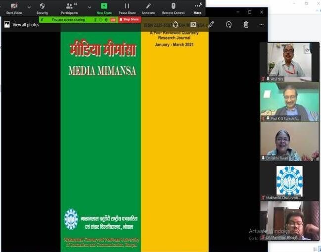 इस अवसर पर विश्वविद्यालय की शोध पत्रिका 'मीडिया मीमांसा' के नये अंक का विमोचन किया गया। यह शोध पत्रिका त्रैमासिक है, जो संचार एवं पत्रकारिता के क्षेत्र में हो रहे शोधकार्यों को समाज तक ले जाने का माध्यम है। कुलपति प्रो. सुरेश ने कहा कि मीडिया मीमांसा के माध्यम से शोध संस्कृति को बढ़ावा देने का प्रयास किया जाएगा। कार्यक्रम का संचालन पत्रकारिता विभाग की अध्यक्ष डॉ. राखी तिवारी ने किया और आभार प्रदर्शन कुलसचिव प्रो. पवित्र श्रीवास्तव ने किया।