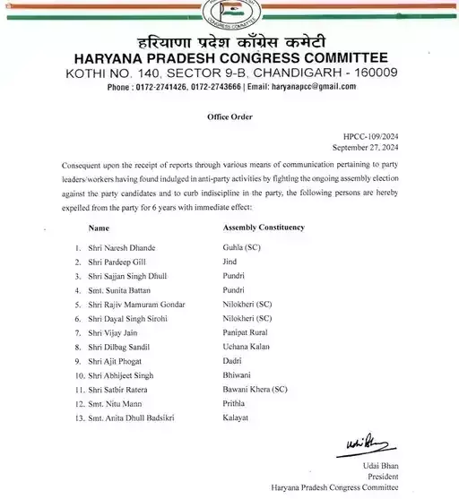 |Haryana Congress Expelled 13 Leaders : हरियाणा विधानसभा चुनाव (Haryana Assembly Elections) के बीच कांग्रेस ने शुक्रवार (27 सितंबर) को पार्टी से 13 नेताओं को 6 साल के लिए निष्कासित कर दिया है। हरियाणा प्रदेश कांग्रेस कमेटी ने बताया कि जिन नेताओं को निष्कासित किया वे पार्टी उम्मीदवारों के खिलाफ चल रहे विधानसभा चुनाव लड़कर पार्टी विरोधी गतिविधियों में लिप्त पाए गए थे।