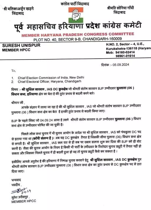 कांग्रेस ने शिकायत में यह भी कहा है कि चुनाव आयोग के नियमों के अनुसार किसी भी पार्टी के प्रत्याशी के रिश्तेदार को चुनाव ड्यूटी में तैनात नहीं किया जा सकता। इस मामले में कांग्रेस ने अपील की है कि हरियाणा में निष्पक्ष चुनाव के लिए सुशील सारवान का तुरंत तबादला किया जाए।