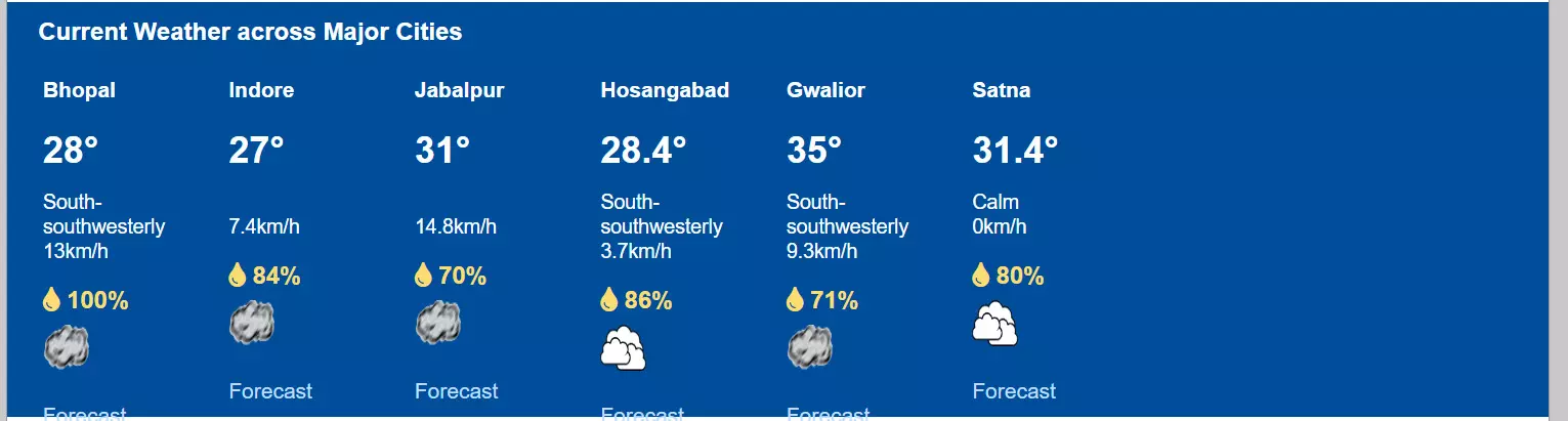 भोपाल, सीहोर, नर्मदापुरम, उज्जैन, देवास, शाजापुर, पन्ना, दमोह, सागर समेत 30 जिलों में तूफान के साथ बिजली और गरज के साथ बारिश का अलर्ट भी जारी किया गया है।