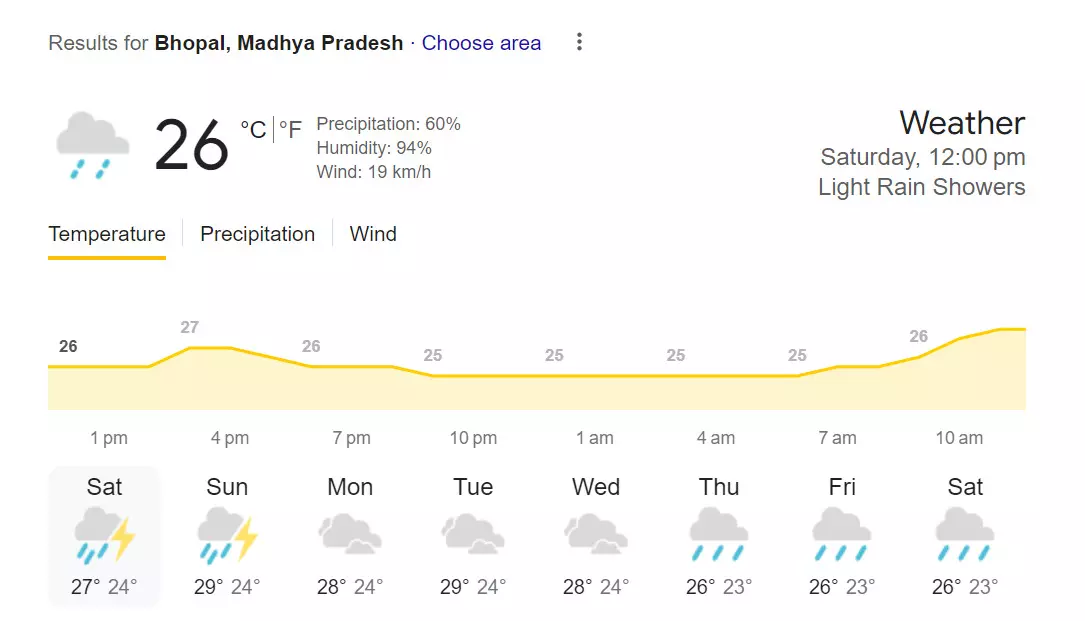 रायसेन (सांची भीमबेटका), सीहोर, गुना और हरदा में बिजली चमकने के साथ बहुत भारी बारिश होने की संभावना है, जबकि अशोकनगर, शिवपुरी, विदिशा (उदयगिरि), भोपाल, राजगढ़, देवास, उत्तरी खंडवा (ओंकारेश्वर), नर्मदापुरम, टीकमगढ़, छतरपुर, पांढुर्ना, दक्षिणी छिंदवाड़ा, शाजापुर, बालाघाट, भिंड और मैहर में बिजली चमकने के साथ भारी बारिश संभव है,पिछले 24 घंटों में बहुत भारी बारिश की सूचना: स्थान वर्षा (मिमी) रतलाम (बाजना) 180 श्योपुर कलां 130 सतना (रघुराजनगर) 91.2 मंदसौर (सीतामऊ) 82.4 झाबुआ (मेघनगर) 74 अलीराजपुर 72.4