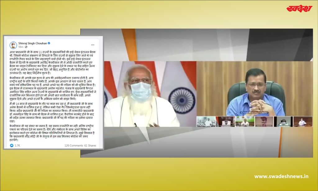 |भोपाल/नईदिल्ली। देश में बढ़ रहे कोरोना की दूसरी लहर ने चारों ओर भय का वातावरण बना दिया है। राजनितिक मत भिन्नता के सभी दल और सरकारें अपना हर संभव प्रयास कर रही हैं। लेकिन कुछ ऐसे राजनेता भी हैं जो स्थिति को सँभालने में मदद करने के स्थान पर अपनी राजनीतिक जमीन बनाने, चमकाने का प्रयास कर रहे हैं। प्रयास यह भी है की एक - दूसरे पर आरोप लगाकर अपनी जिम्मेदारी से मुक्त हो जाएँ। ऐसा ही एक वाक्या प्रधानमंत्री नरेंद्र मोदी द्वारा 11 राज्यों के मुख्यमंत्री के साथ बैठक में उत्पन्न हुआ। सभी राज्यों के मुख्यमंत्रियों ने अपने अपने सुझाव दिए और अपने राज्यों में चल रहे प्रयोगों के बारे में जानकारी दी। लेकिन जब दिल्ली मुख्यमंत्री अरविंद केजरीवाल की बारी आयी तो उन्होंने सुझाव देने और अपने राज्यों में चल रहे प्रयोगों के बारे में जानकारी देने की बजाये (क्या बताने के लिए कुछ था भी...सोशल मीडिया पर जनता पूछ रही है सवाल) उल्टा दूसरे राज्यों और केंद्र पर आरोप लगाना शुरू कर दिए। इतना ही नहीं आंतरिक चर्चा का लाइव टेलीकास्ट भी कर दिया। जिससे जनता में यह सन्देश जाए की मेरी जिम्मेदारी नहीं हैं यह तो केंद्र का विषय है। मप्र के मुख्यमंत्री शिवराज सिंह भी इस बैठक में शामिल हुए। उपरान्त मुख्यमंत्री शिवराज सिंह ने सोशल मीडिया पर केजरीवाल को जबाव दिया।