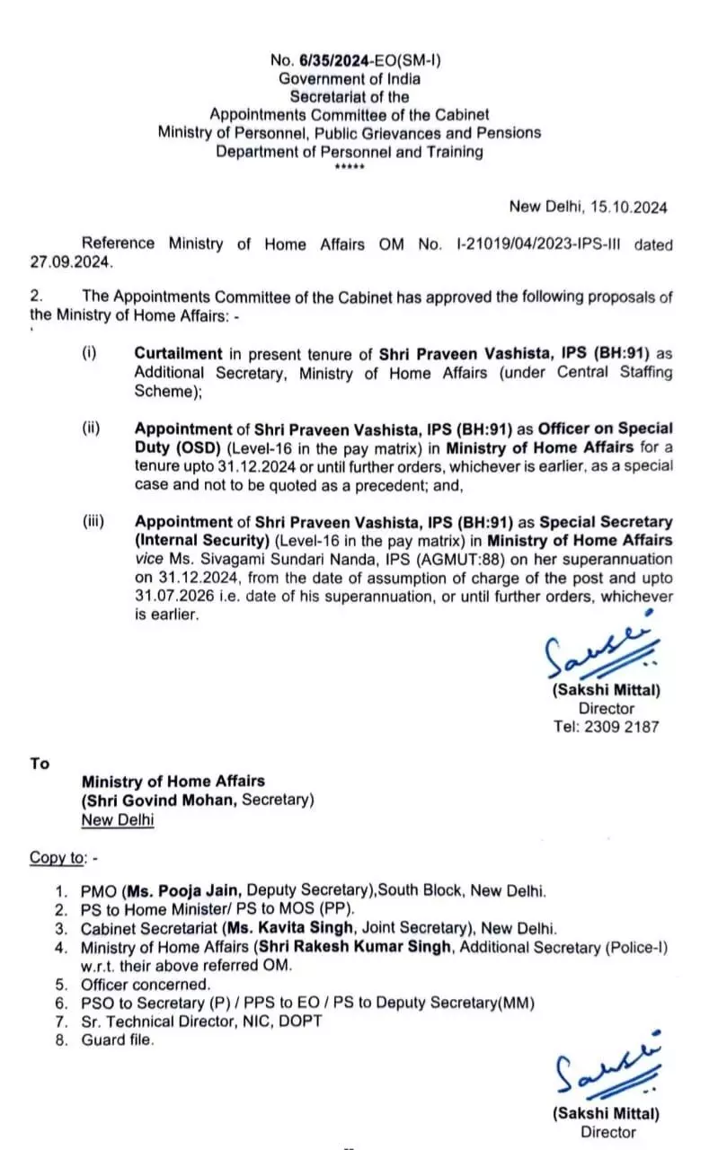 जारी किये गए आदेश में कहा गया है कि प्रवीण वशिष्ठ, आईपीएस (बीएच:91) के अतिरिक्त सचिव, गृह मंत्रालय (केंद्रीय स्टाफिंग योजना के तहत) के वर्तमान कार्यकाल में कटौती की जाती है। आईपीएस प्रवीण वशिष्ठ को गृह मंत्रालय में विशेष सचिव (आंतरिक सुरक्षा) के रूप में नियुक्त किया जाता है।
