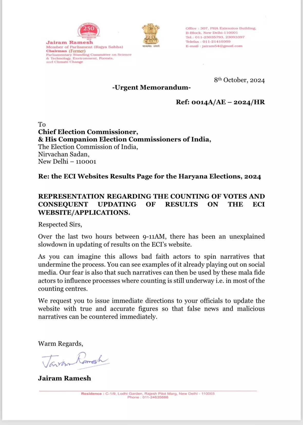 एक्स पर ईसीआई को टैग करते हुए जयराम रमेश ने कहा कि, "लोक सभा नतीजों की तरह हरियाणा में भी चुनावी रुझानों को जानबूझकर चुनाव आयोग की वेबसाइट पर धीमे धीमे शेयर किया जा रहा है। क्या भाजपा प्रशासन पर दबाव बनाने की चेष्टा कर रही है?"