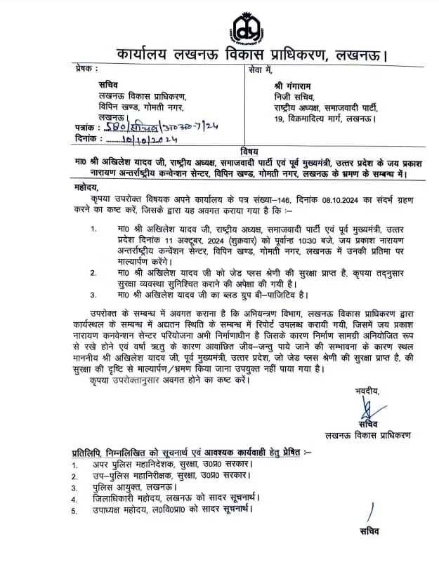 लखनऊ विकास प्राधिकरण ने जयप्रकाश नारायण की जयंती के अवसर पर JPNIC जाने के अखिलेश यादव के कार्यक्रम के संबंध में LDA सचिव ने एक पत्र जारी किया है। इसमें लिखा है, "JPNIC एक निर्माण स्थल है, जहां निर्माण सामग्री बेतरतीब ढंग से फैली हुई है और बारिश के कारण कई कीड़े होने की संभावना है... सपा प्रमुख अखिलेश यादव को जेड प्लस श्रेणी की सुरक्षा प्राप्त है, जिसके कारण सुरक्षा कारणों से उनका प्रतिमा पर माल्यार्पण करना और JPNIC का दौरा करना सुरक्षित और उचित नहीं है।"