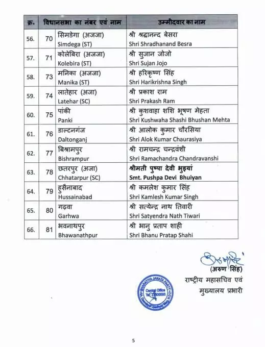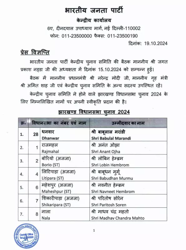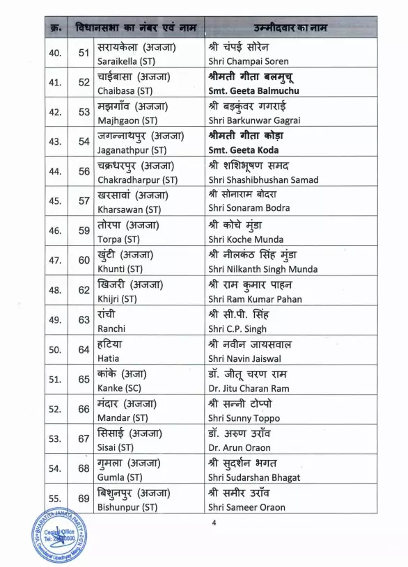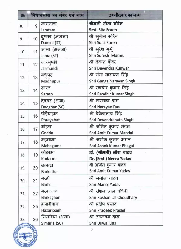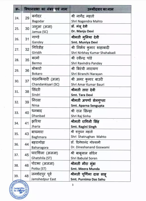 |BJP Candidates List : भारतीय जनता पार्टी ने झारखंड विधानसभा चुनाव (Jharkhand Election 2024) के लिए 66 उम्मीदवारों की पहली सूची जारी की है। बेजीपी के राज्य प्रमुख बाबूलाल मरांडी धनवार से, लोबिन हेम्ब्रोम बोरियो से, सीता सोरेन जामताड़ा से, पूर्व सीएम चंपई सोरेन सरायकेला से, गीता बालमुचू चाईबासा से, गीता कोड़ा जगनाथपुर से, मीरा मुंडा पोटका से चुनाव लड़ेंगी। पूर्व सीएम चंपई सोरेन के बेटे बाबूलाल सोरेन को घाटशिला से टिकट मिला है। वहीं राज्यपाल रघुवर दास की बहु पूर्णिमा दास को जमशेदपुर ईस्ट से टिकट मिला है।