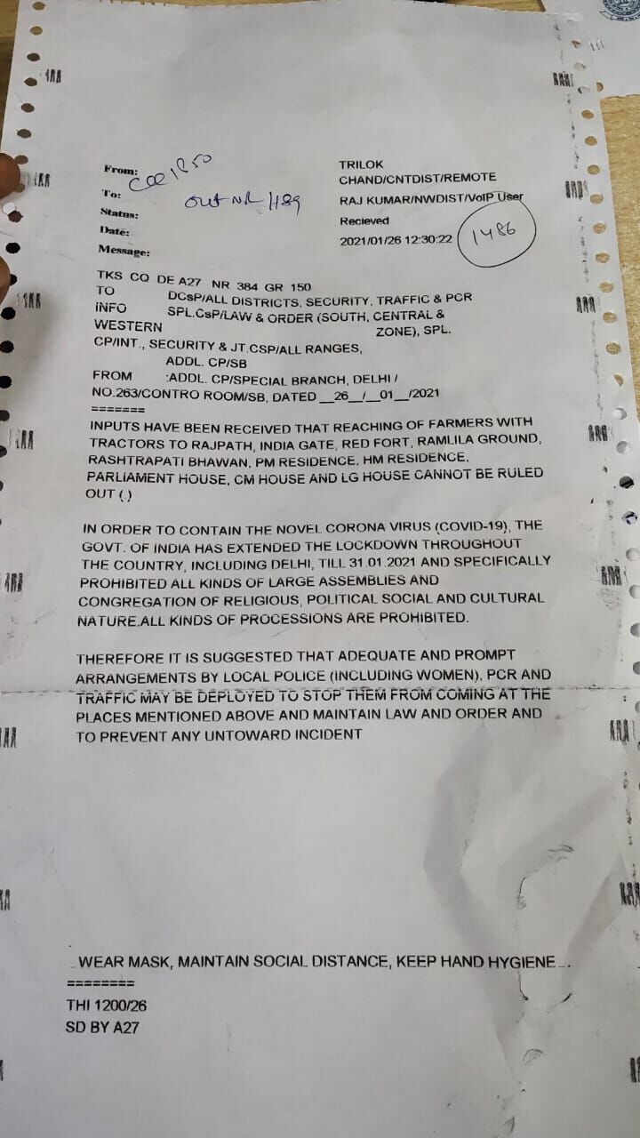 ट्रैक्टर रैली निकाल रहे किसान दिल्ली पुलिस की बात मानने को तैयार नहीं हैं। उनके द्वारा तय की गई सभी शर्तों का उल्लंघन किसान कर चुके हैं। वह ना केवल बाहरी रिंग रोड, बल्कि नई दिल्ली के बॉर्डर तक भी पहुंच चुके हैं। ऐसे में दिल्ली पुलिस को इनपुट मिला है कि ये लोग लाल किले के बाद राष्ट्रपति भवन, संसद भवन, गृह मंत्री निवास, प्रधानमंत्री निवास, मुख्यमंत्री निवास व उप राज्यपाल निवास की तरफ भी जा सकते हैं। इसके अलावा राजपथ में उस जगह भी वह जा सकते हैं, जहां पर सुबह गणतंत्र दिवस की परेड का आयोजन किया गया था।