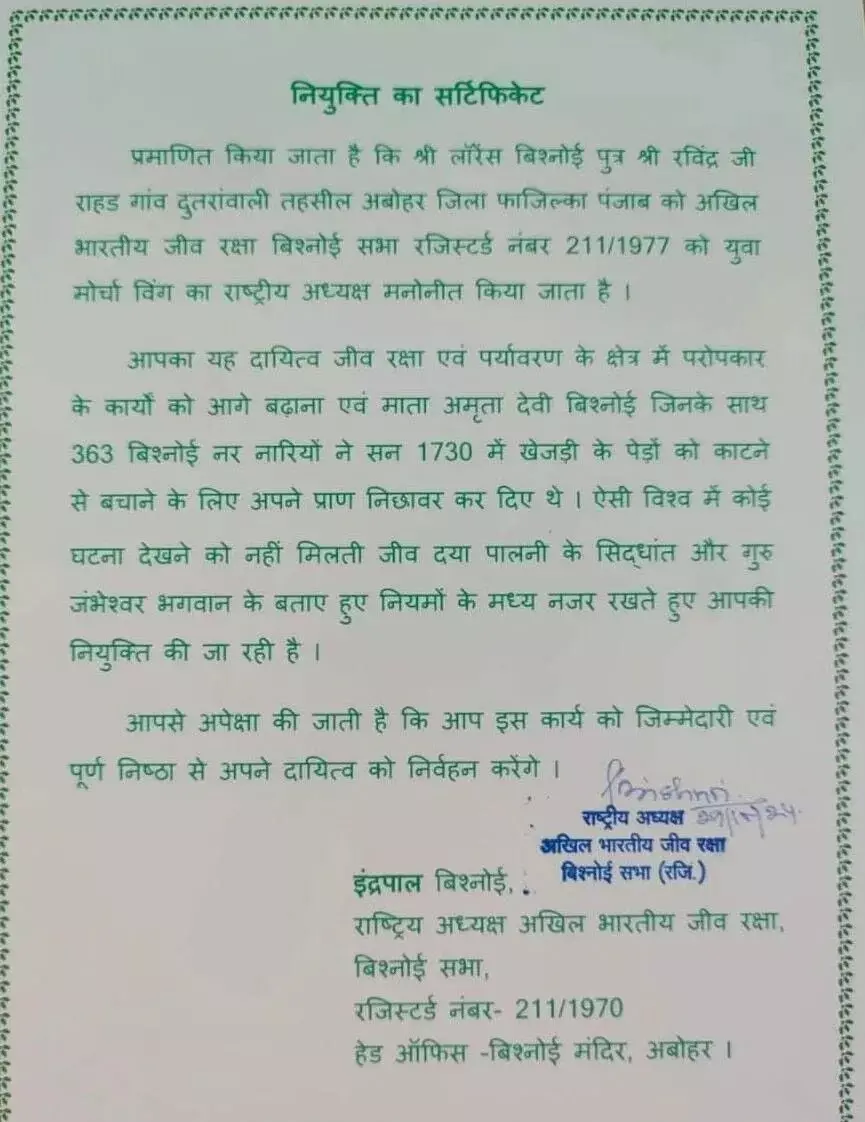 Lawrence Bishnoi: लॉरेंस बिश्नोई बने यूथ विंग के अध्यक्ष, जीव रक्षा मोर्चा ने लेटर किया जारी