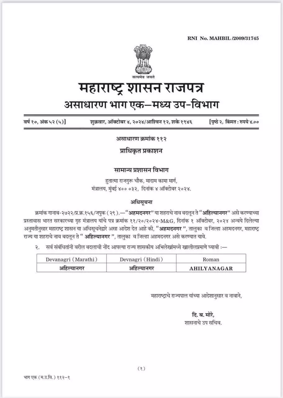|मुंबई: महाराष्ट्र के अहमदनगर जिले का नाम अब अहिल्याबाई नगर होगा। केंद्रीय गृह मंत्रालय ने इस नाम परिवर्तन को मंजूरी दे दी है। इस साल मार्च में राज्य मंत्रिमंडल ने अहमदनगर का नाम बदलने का प्रस्ताव पारित किया था और इसके लिए केंद्र सरकार से अनुमति मांगी थी। यह कदम 18वीं सदी की महान शासिका अहिल्याबाई होल्कर को सम्मान देने के उद्देश्य से उठाया गया है, जिनका जन्म इसी जिले के चौंडी गांव में हुआ था।