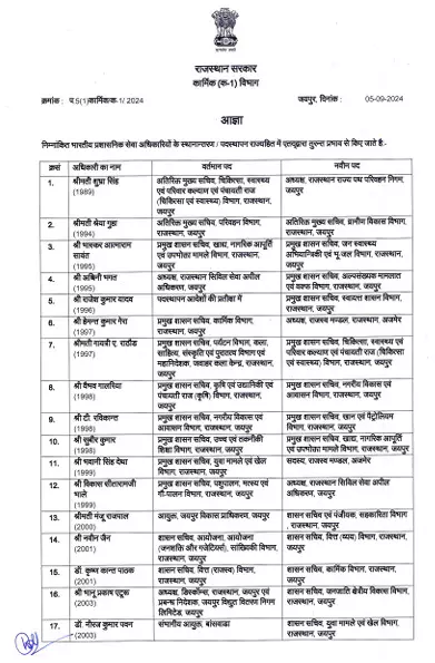 |Rajasthan IAS Transfer : मुख्यमंत्री भजनलाल सरकार ने बड़ा प्रशासनिक फेरबदल किया है। राजस्थान के 108 IAS अफसरों को इधर से उधर किया गया हैं। इनमें से जहां 96 अधिकारियों के तबादले हुए हैं वहीं 20 अफसरों को अतिरिक्त प्रभार दिया गया है और 10 अधिकारियों को आईएएस की पोस्टिंग दी गई है।