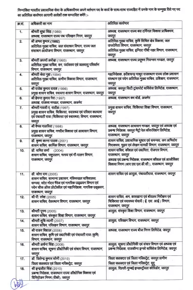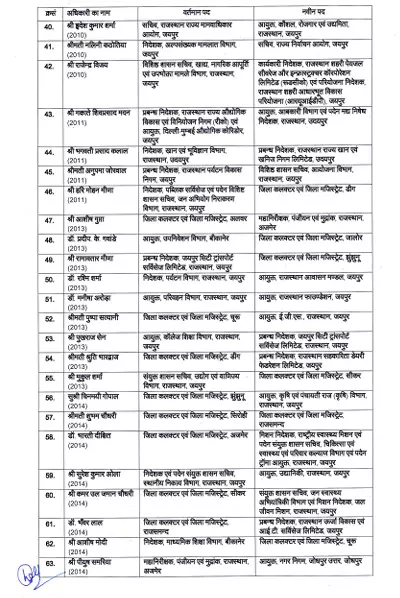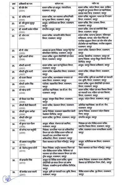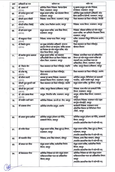 पूर्व सीएम अशोक गहलोत के ओएसडी रह चुके देवाराम सैनी, सचिन पायलट और पूर्व परिवहन मंत्री बृजेन्द्र ओला के एसए रह चुके आकाश तोमर, UDH में काफी समय तक संयुक्त सचिव जैसे अहम पद पर रह चुके हैं मनीष गोयल, गहलोत सरकार के समय CMO में संयुक्त सचिव रह चुके हैं अजय असवाल और शाहीन अली, सूचना और जनसंपर्क निदेशालय के निदेशक जैसे अहम पद पर रह चुके हैं।