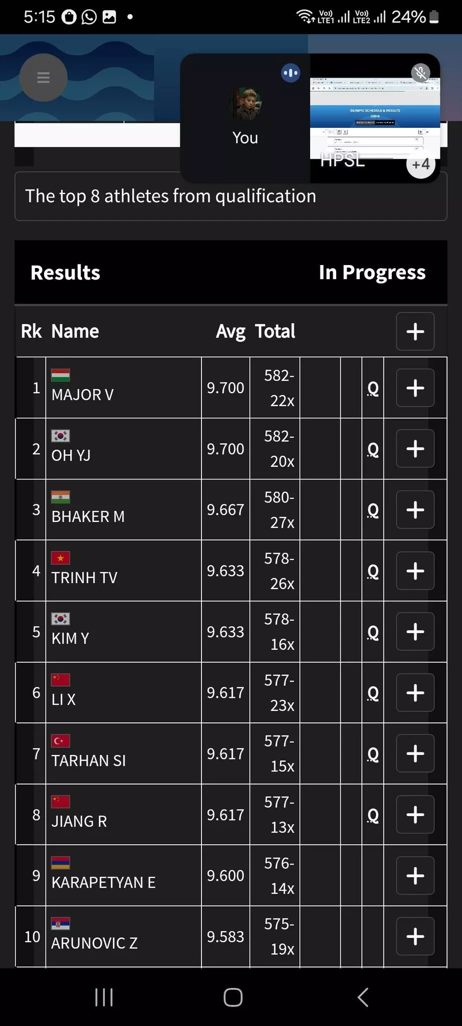 आपको बताते चलें कि, आज के खेल में अन्य देशों के शूटरों ने भी खेल दिखाया है। हंगरी की वेरोनिका मेजर ने 582-22x प्वॉइंट्स के साथ टॉप पर फिनिश किया,दक्षिण कोरिया की जिन ये ओह 582-20x प्वॉइंट्स के साथ दूसरे नंबर रही. वहीं, इसके अलावा वियेतनाम की विन्ह थू त्रिन, दक्षिण कोरिया की येजी किम, चीन जुए ली, तुर्किये की इलायदा सेवाल तरहान और चीन रेंक्सिन जियांग फाइनल्स के लिए क्वॉलीफाई करने में कामयाब रही।