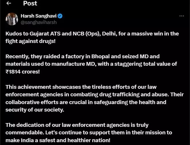 गुजरात के गृह राज्य मंत्री हर्ष संघवी ने एक्स पर लिखा, "ड्रग्स के खिलाफ लड़ाई में बड़ी जीत के लिए गुजरात एटीएस और एनसीबी (ऑप्स), दिल्ली को बधाई!हाल ही में, उन्होंने भोपाल में एक फैक्ट्री पर छापा मारा और एमडी और एमडी बनाने में इस्तेमाल होने वाली सामग्री जब्त की। जब्त की गई ड्रग की कुल कीमत 1814 करोड़ रुपए थी। यह उपलब्धि ड्रग तस्करी और दुरुपयोग से निपटने में हमारी कानून प्रवर्तन एजेंसियों के अथक प्रयासों को दर्शाती है। हमारे समाज के स्वास्थ्य और सुरक्षा की रक्षा में उनके सहयोगात्मक प्रयास महत्वपूर्ण हैं। हमारी कानून प्रवर्तन एजेंसियों का समर्पण वास्तव में सराहनीय है। आइए भारत को सबसे सुरक्षित और स्वस्थ राष्ट्र बनाने के उनके मिशन में उनका समर्थन करना जारी रखें।"