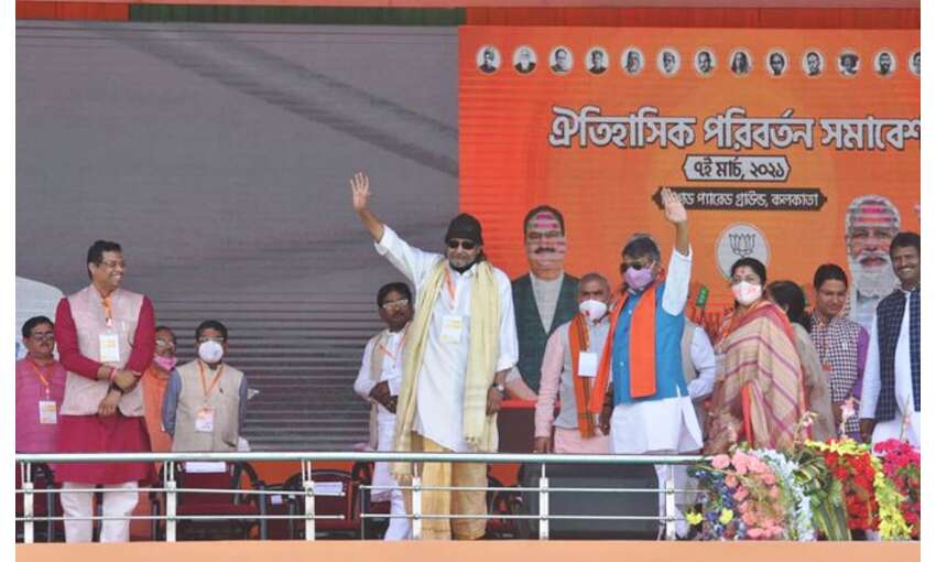 |कोलकाता। ब्रिगेड परेड मैदान में प्रधानमंत्री नरेन्द्र मोदी के आने से पहले ही बॉलीवुड के दिग्गज अभिनेता मिथुन चक्रवर्ती पहुंच गए। उनके मैदान में पहुंचते ही कार्यकर्ताओं ने मिथुन चक्रवर्ती जिंदाबाद, भारतीय जनता पार्टी जिंदाबाद के नारे लगाए। उन्होंने भाजपा की सदस्यता ली। मंच से मिथुन चक्रवर्ती ने भाजपा का झंडा लहराया और प्रदेश भाजपा अध्यक्ष दिलीप घोष तथा कैलाश विजयवर्गीय ने उन्हें भारतीय जनता पार्टी का चुनाव चिन्ह अंकित अंग वस्त्र पहनाया है।