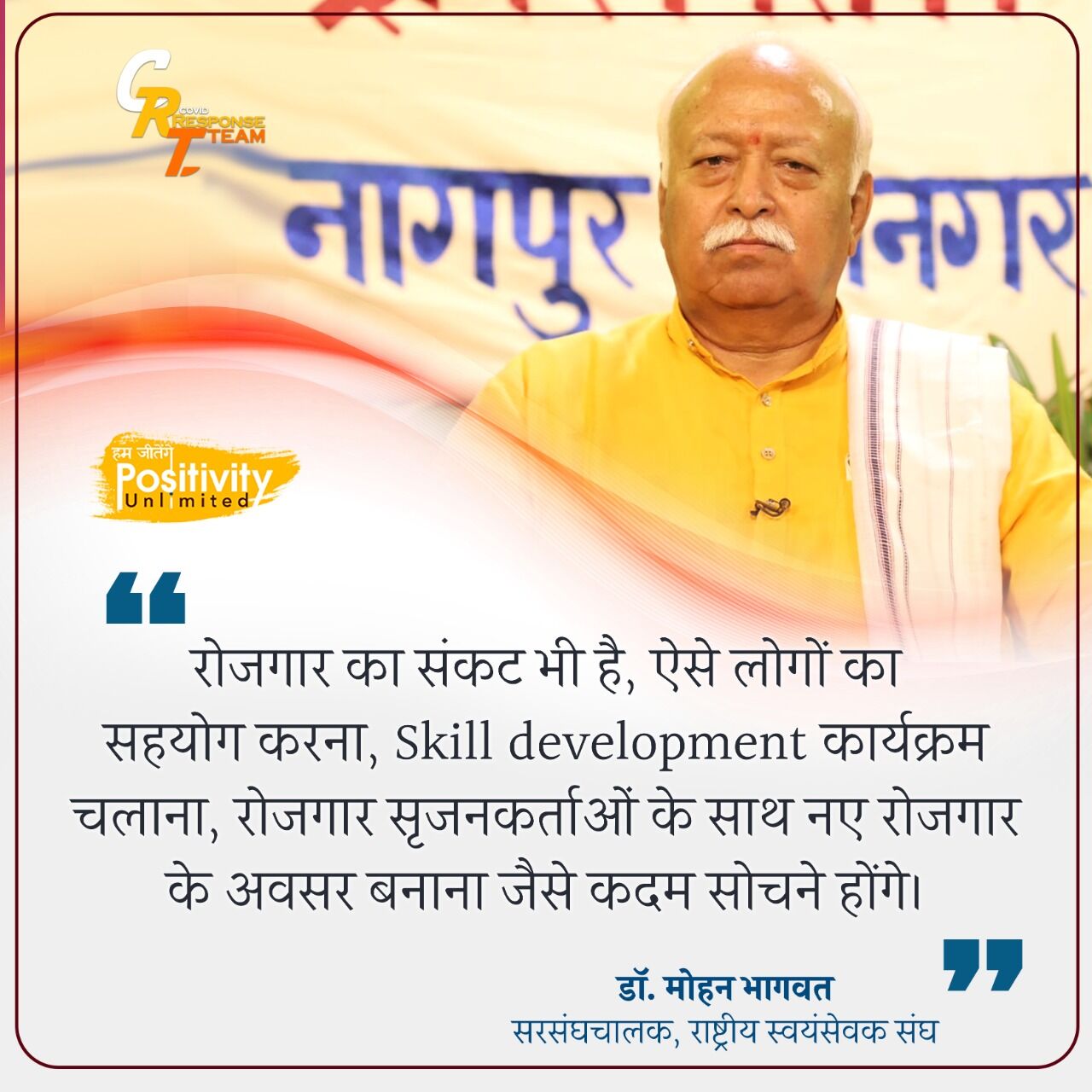 भागवत ने कहा कि पहली लहर के बाद हम गफलत में आ गए और अब तीसरी लहर आने की बात हो रही है। इससे अर्थव्यवस्था, रोजगार, शिक्षा आदि पर गहरा प्रभाव पड़ा है। आने वाले दिनों में अर्थव्यवस्था पर और असर पड़ सकता है, इसलिए इसकी तैयारी हमें अभी से करनी होगी। भविष्य की इन चुनौतियों की चर्चा से घबराना नहीं है बल्कि ये चर्चा इसलिए जरूरी है ताकि हम आने वाली चुनौतियों का सामना करने के लिए समय रहते तैयारी कर सकें। उन्होंने कहा कि स्वयं को सजग, सक्रिय व स्वस्थ रखते हुए धैर्य व अनुशासन के साथ हमें सेवा कार्यों में जुटना चाहिए। कोरोना के रोगियों को अस्पतालों में बिस्तर,ऑक्सीजन आदि उपलब्ध हों, इसके प्रयास करने चाहिए। सेवा कार्यों में लगे संगठनों को सहयोग करना चाहिए। अपने आस—पास के उन परिवारों की चिंता करनी चाहिए जिन पर आर्थिक संकट है। घर पर खाली न बैठें, कुछ नया सीखें, परिवारों में संवाद बढ़ाएं।