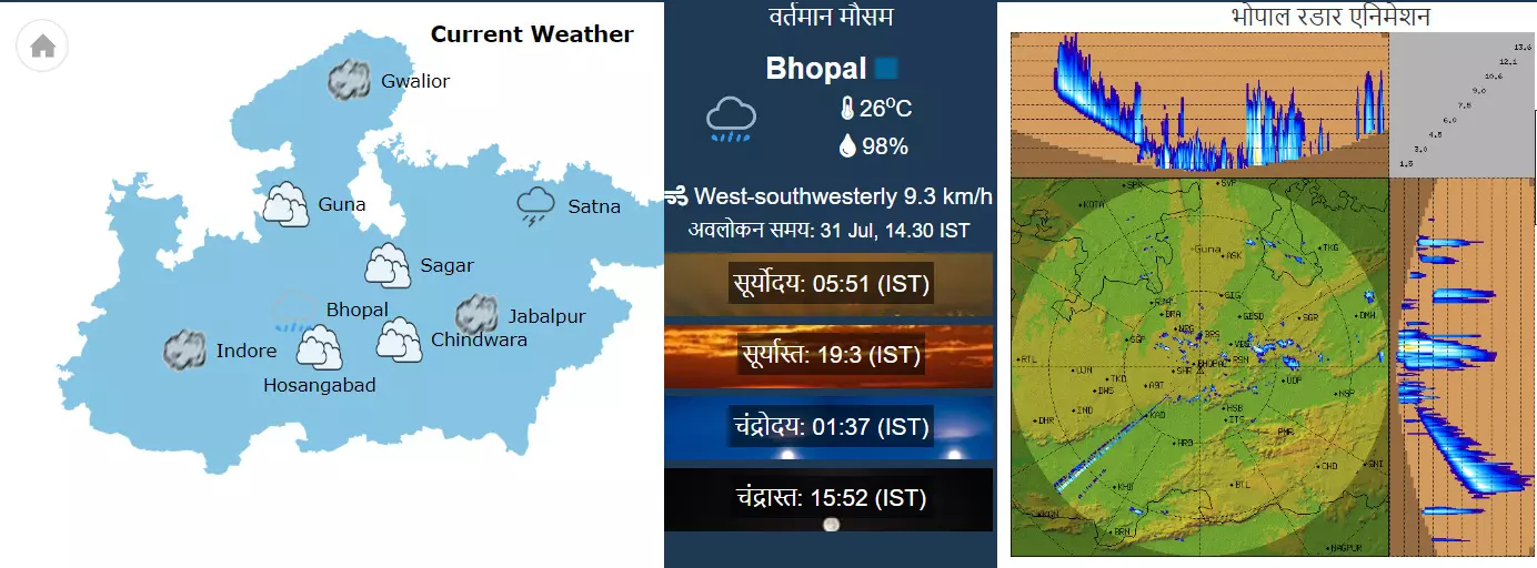 मध्य प्रदेश में मानसून के पहले 38 दिनों में ही राज्य में मौसमी बारिश 50 प्रतिशत हो चुकी है। पूरे मध्य प्रदेश में सबसे ज्यादा बारिश सिवनी जिले में दर्ज की गई है, यहां करीब 31.26 इंच बारिश हुई 1 अगस्त गुरूवार को छतरपुर, छिंदवाड़ा, सिवनी, मंडला, बालाघाट, डिंडोरी और अनूपपुर में भारी बारिश का अलर्ट जारी किया गया है। आईएमडी भोपाल के वैज्ञानिक प्रकाश दवले के अनुसार, दक्षिण-पूर्व मध्य प्रदेश में एक चक्रवाती परिसंचरण सक्रिय है। मानसून की द्रोणिका गुना, रायसेन और मंडला से बंगाल की खाड़ी की ओर बढ़ रही है। इसके अलावा, दो अन्य मौसमी सिस्टम सक्रिय हैं।
