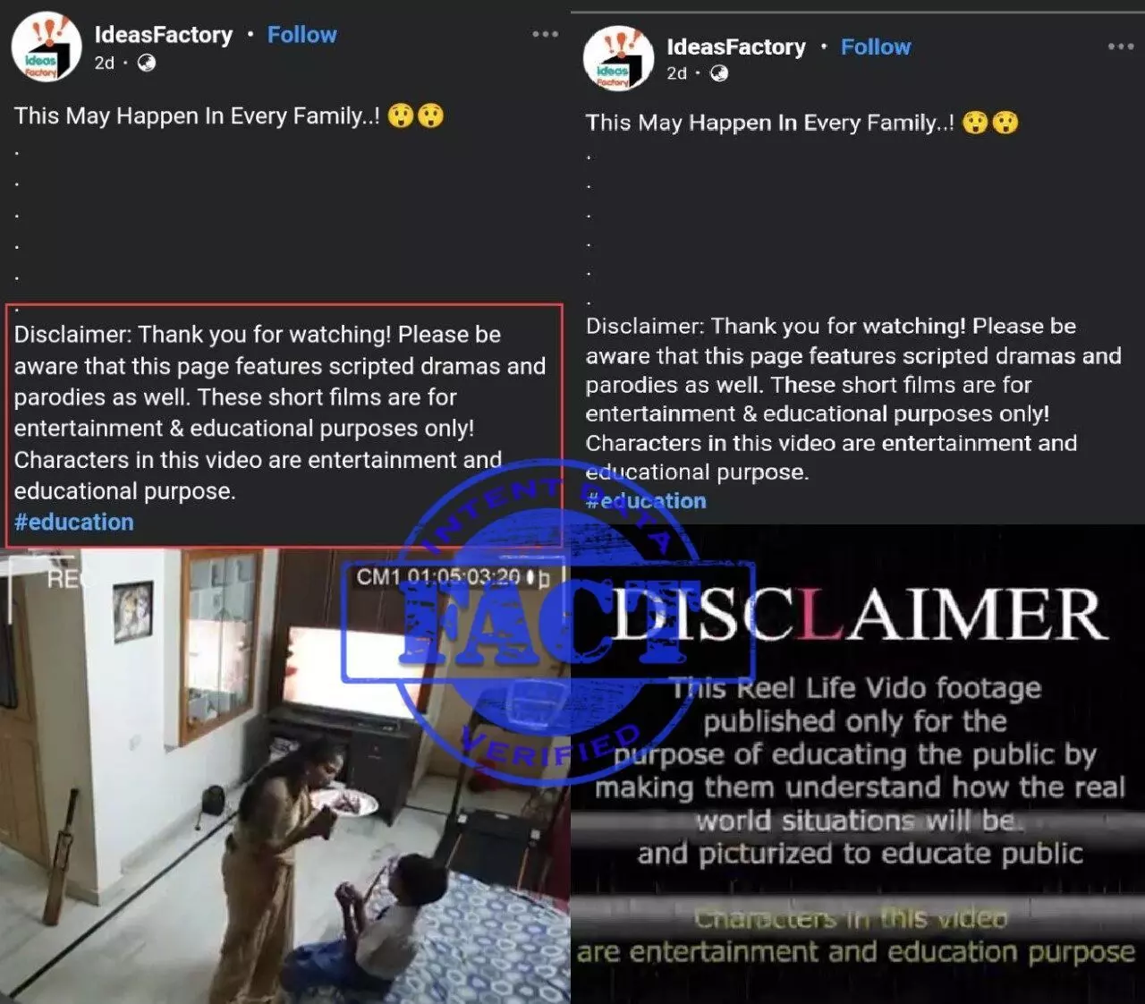 सोशल मीडिया प्लैटफॉर्म पर यह वीडियो एक वास्तविक घटना का वीडियो होने का दावा करते हुए एक साझा किया गया। इसमें एक लड़के द्वारा अपनी मां का मोबाइल फोन छीनने और उसे पढ़ाई के लिए मजबूर करने पर क्रिकेट बैट से मारते हुए दिखाया गया है। सच तो ये है कि ये वीडियो स्क्रिप्टेड है और इसका हकीकत से कोई लेना-देना नहीं है। हमें फेसबुक पर पूरा वीडियो मिला, जिसमें एक जिसमें लिखा है कि वीडियो केवल शैक्षिक और मनोरंजन उद्देश्यों के लिए बनाया गया है।