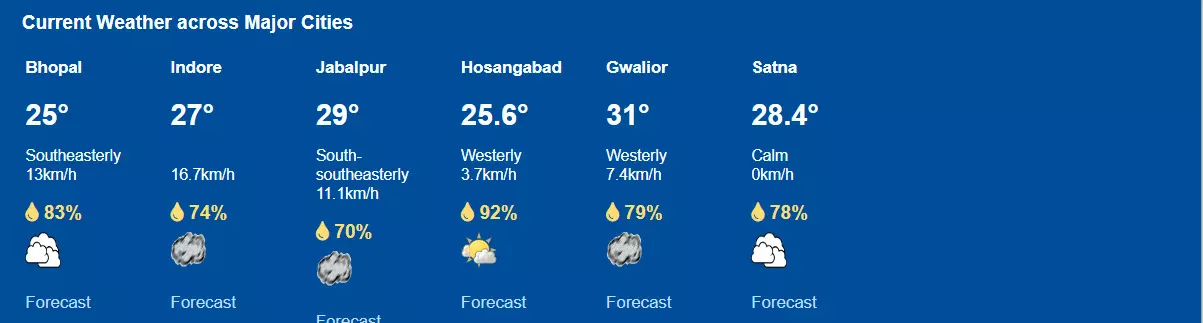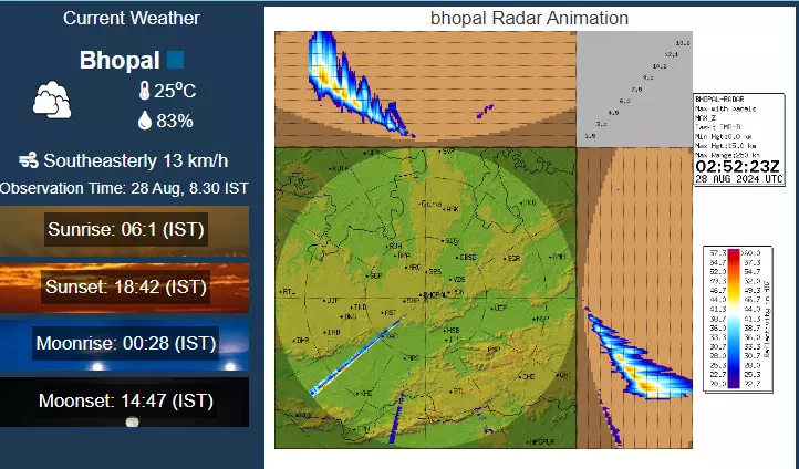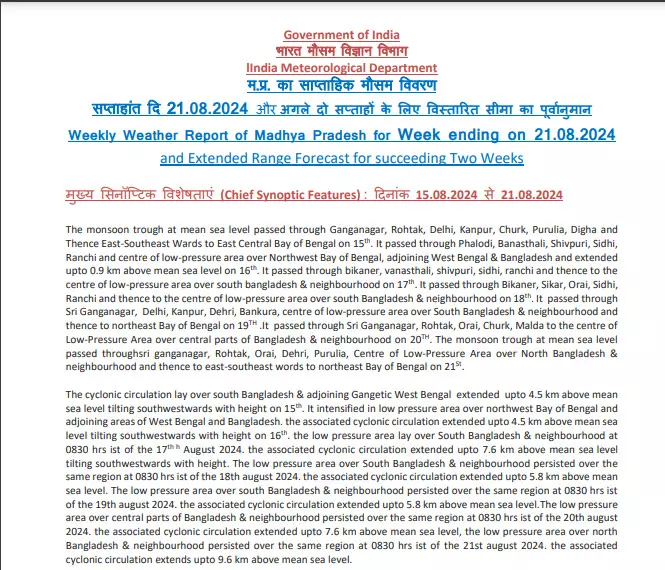 30-31 अगस्त के बीच एक मजबूत मौसमी सिस्टम बनने की उम्मीद है, जिससे जबलपुर, रीवा, शहडोल और सागर संभागों के 28 जिलों सहित राज्य के पूर्वी हिस्सों में भारी बारिश होने की संभावना है। भोपाल, इंदौर, ग्वालियर, नर्मदापुरम, चंबल और उज्जैन संभागों सहित राज्य के पश्चिमी हिस्सों में गरज के साथ हल्की बारिश हो सकती है। एक वरिष्ठ मौसम वैज्ञानिक ने बताया कि कम दबाव वाला क्षेत्र सिस्टम आगे बढ़ गया है और मानसून की द्रोणिका सागर से होकर बंगाल की खाड़ी की ओर बढ़ रही है। जिससे अगले दो दिनों के लिए भारी बारिश का कोई अलर्ट नहीं है और 29 अगस्त तक पूरे राज्य में कोई महत्वपूर्ण बारिश की उम्मीद नहीं है।