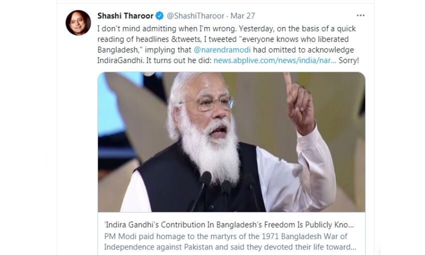 |नई दिल्ली/वेब डेस्क। बांग्लादेश के दौरे के समय प्रधानमंत्री नरेन्द्र मोदी के बयान का सच सामने आने के बाद ट्विटर के बयानवीरों ने चुप्पी साध ली है। सच तो यह है कि 12 अगस्त 1971 को बांग्लादेश की आजादी के लिए जब जन सत्याग्रह हुआ था, तब नरेंद्र मोदी भी इस सत्याग्रह में शामिल थे और जेल भी गए थे। इस सत्याग्रह का नेतृत्व पूर्व प्रधानमंत्री स्व. अटल जी ने किया था। लेकिन उनके इस बयान का कांग्रेस सहित कई विपक्षी दलों ने गलतबयानी कर भ्रम फैलाने का काम किया जबकि तथ्य ठीक इसके विपरीत हैं। प्रधानमंत्री नरेंद्र मोदी ऐसे राजनेता हैं जो आए दिन अपने बयानों से विपक्षी खेमे में हडक़ंप मचा देते हैं और ट्विटरबाज भी ताक में रहते हैं की कब उनको ट्रोल करें। खैर, प्रधानमंत्री मोदी ने बांग्लादेश दौरे के अवसर पर बांग्लादेश की आजादी के स्वर्ण जयंती और बंगबंधु शेख मुजीबुर्रहमान की जन्म शतादी के अवसर पर ढाका में आयोजित मुय समारोह में वर्ष 1971 के युद्ध को याद करते हुए कहा था कि "बांग्लादेश की आजादी के लिए उस संघर्ष में शामिल होना मेरे जीवन के भी पहले आंदोलनों में से एक था। मेरी उम्र 20-22 साल रही होगी जब मैंने और मेरे कई साथियों ने बांग्लादेश के लोगों की आजादी के लिए सत्याग्रह किया था। बांग्लादेश की आजादी के समर्थन में तब मैंने गिरतारी भी दी थी और जेल जाने का अवसर भी आया था।" उनके इस वतव्य के कई मायने निकाले गए। कांग्रेस समेत विपक्ष के कई नेताओं ने इसे कोरी गप्प करार दिया। ट्विटर बाजों को भी काम मिल गया सो वो ट्विटर पर हैशटैग #LieLikeModi ट्रेंड कराने लगे। जल्दबाजी में हेडलाइन और ट्वीट पढक़र शशि थरूर ने तो अपनी प्रतिक्रिया भी दे दी हालांकि जब उन्हें सच्चाई पता चली तो उन्होंने माफी भी मांग ली। लेकिन लोगों ने विपक्ष को जवाब देने के लिए इतिहास के पन्ने खंगाले और तथ्य सहित विभिन्न माध्यमों से विपक्ष को जवाब दिया। उसके बाद मानों विपक्ष की आवाज दबने लगी।