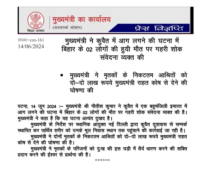 कुवैत आग की घटना में गई दो श्रमिकों की जान, नीतीश सरकार ने मुआवजे का किया ऐलान
