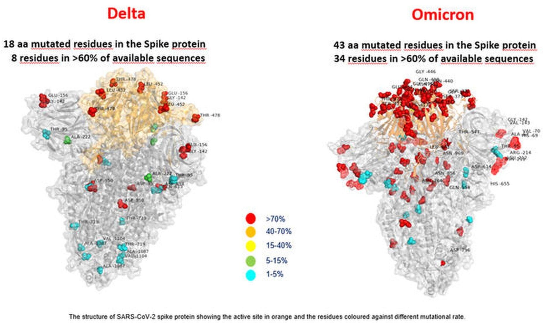 शोधकर्ताओं की टीम ने ओमीक्रॉन की तीन डाइमेंशनल तस्वीर जारी की हैं। यह तस्वीर किसी नक्शे की तरह दिखती हैं। इसमें डेल्टा वेरिएंट से अधिक म्यूटेशन है जो ह्यूमन सेल्स के संपर्क में आता है। इसका अर्थ है कि नए वेरिएंट ने मानव प्रजाति के हिसाब से खुद को अनुकूल किया है।