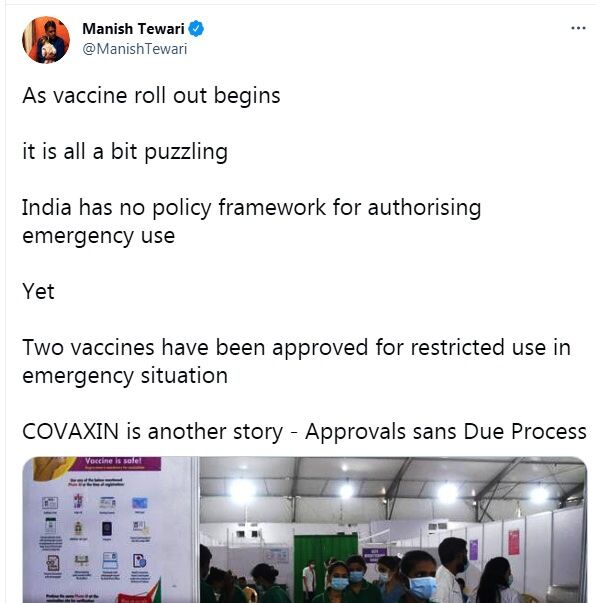 वहीँ कांग्रेसी नेता मनीष तिवारी ने वैक्सीन को लेकर कहा था कि नरेंद्र मोदी भारतीयों को गिनी पिग बना रहे हैं। उन्होंने ट्वीट कर लिखा था - " वैक्सीन प्रोग्राम शुरू हो चुका है. ये थोड़ा सा पेचीदा है. भारत के पास ऐसा कोई नीतिगत फ्रेमवर्क नहीं है जो वैक्सीन के आपातकालीन उपयोग की अनुमति देता हो. फिर भी आपातकालीन स्थिति में दो वैक्सीनों के प्रतिबंधित उपयोग को अनुमति दे दी गई. दूसरी तरफ कोवैक्सीन की अपनी एक अलग कहानी है. बिना प्रक्रिया पूरी हुए ही अप्रूवल दे दिया गया। "