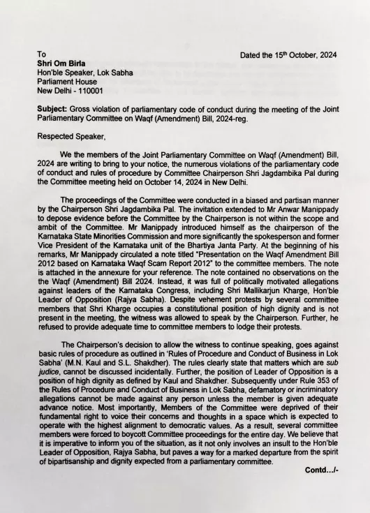 विपक्षी सांसदों द्वारा लोकसभा अध्यक्ष को भेजे गए पत्र में लिखा है कि, "समिति की कार्यवाही अध्यक्ष जगदंबिका पाल द्वारा पक्षपातपूर्ण और पक्षपातपूर्ण तरीके से संचालित की गई। अध्यक्ष द्वारा समिति के समक्ष साक्ष्य प्रस्तुत करने के लिए अनवर मणिपड्डी को दिया गया निमंत्रण समिति के दायरे और अधिकार क्षेत्र में नहीं है...हम आपसे इस मामले में तत्काल हस्तक्षेप करने का अनुरोध करते हैं, और आपसे अपेक्षा करते हैं कि, आप समिति के अध्यक्ष को द्विपक्षीय होने और संसदीय मानदंडों को बनाए रखने के उनके कर्तव्य की याद दिलाएंगे।"