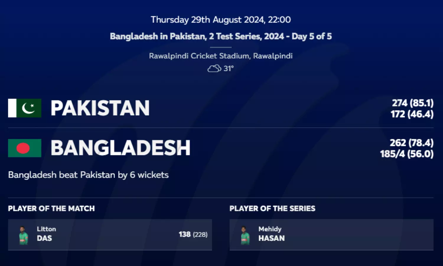 |बांग्लादेश ने रावलपिंडी में दूसरे टेस्ट के 5वें दिन पाकिस्तान को छह विकेट से हराकर रचा इतिहास।