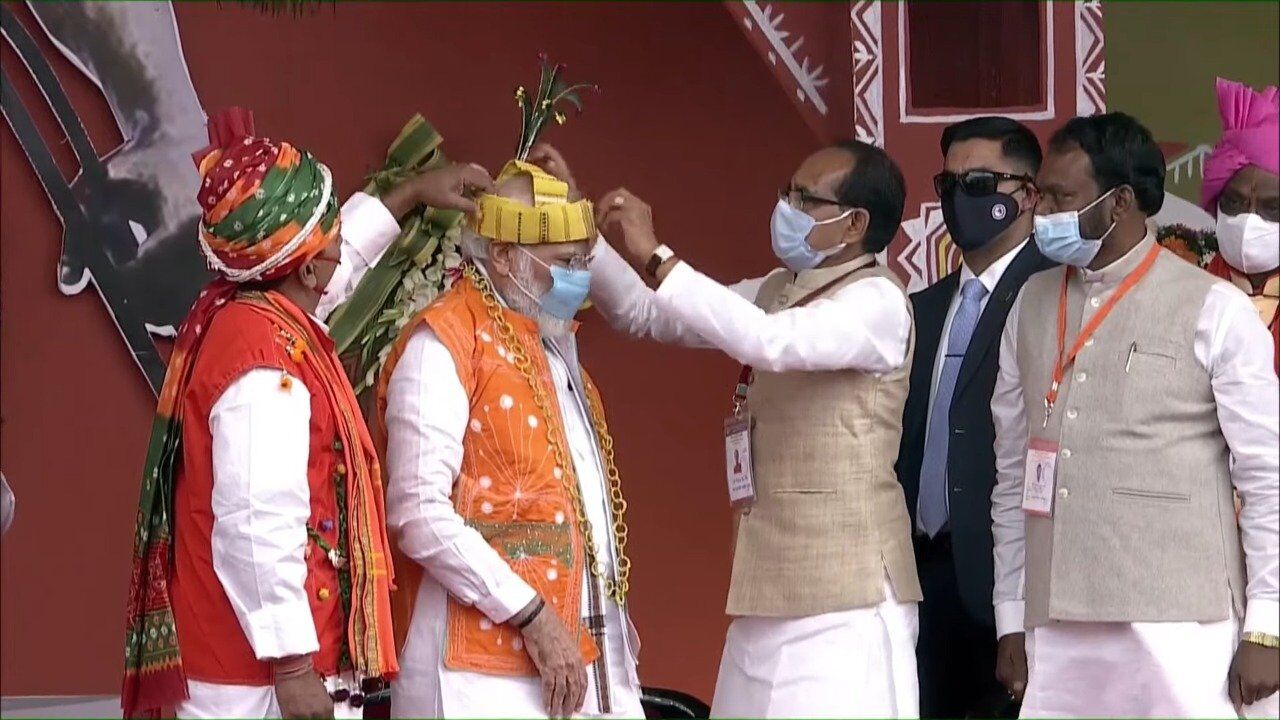 |भोपाल। प्रधानमंत्री नरेन्द्र मोदी मध्य प्रदेश की राजधानी भोपाल में सोमवार को जनजातीय गौरव दिवस के मौके पर आयोजित जनजातीय महासम्मेलन में पहुंच गए हैं। उन्होंने यहां मंच पर जनजातीय जननायक भगवान बिरमा मुंडा के चित्र पर पुष्प अर्पित कर नमन किया। इस मौके पर मुख्यमंत्री शिवराज सिंह चौहान मौजूद रहे। मंच पर 13 आदिवसी नेताओं के साथ केन्द्रीय और राज्य के मंत्री एवं जनप्रतिनिधि मौजूद हैं।