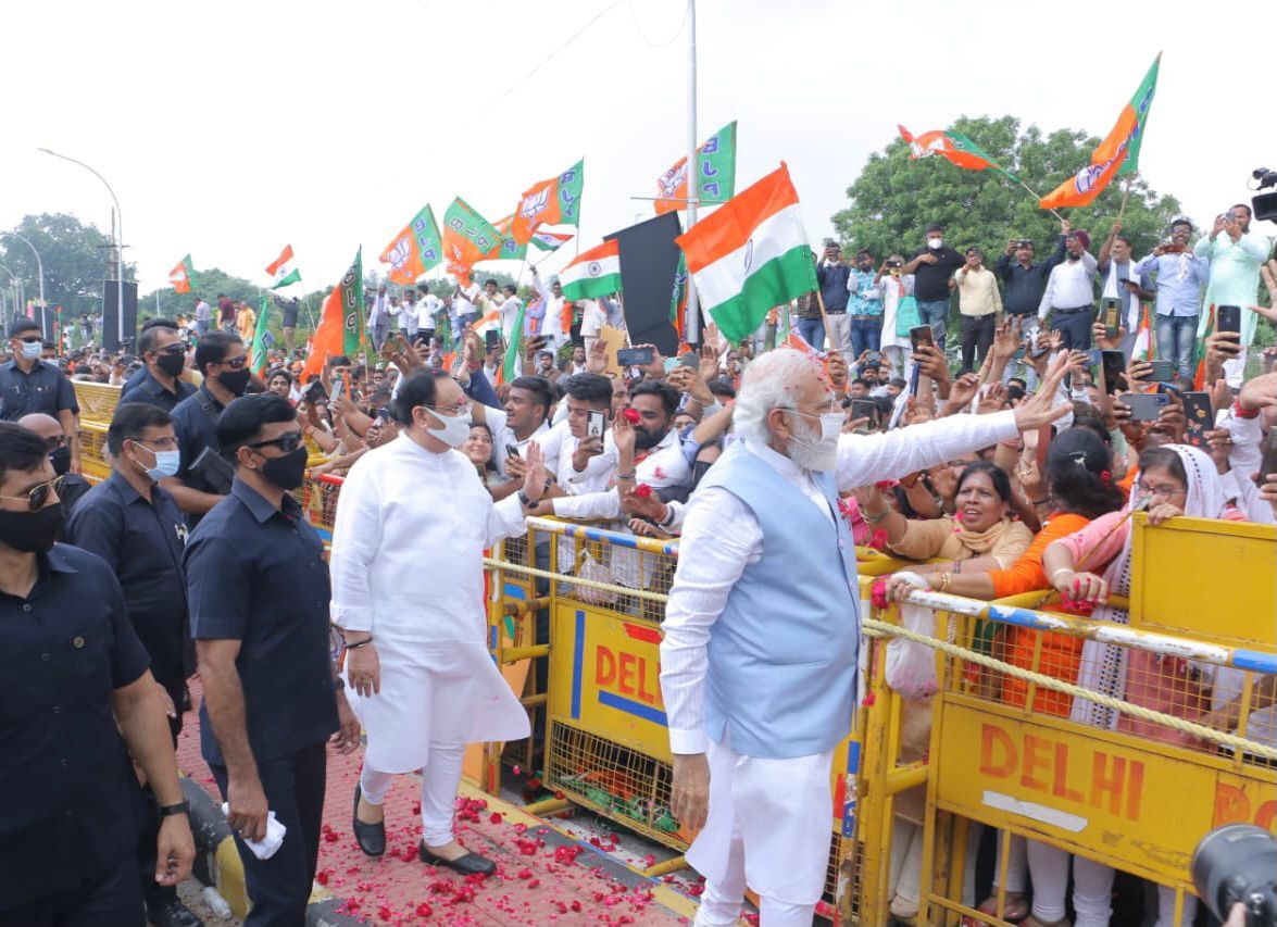 पालम एयरपोर्ट पर पार्टी अध्यक्ष जेपी नड्डा के नेतृत्व में भाजपा कार्यकर्ताओं ने उनका जोर शोर से स्वागत किया। प्रधानमंत्री करीब दो किलोमीटर पैदल चले और इस दौरान पार्टी कार्यकर्ताओं और लोगों के साथ मिलते हुए और उनका धन्यवाद करते गए। प्रधानमंत्री की प्रशंसा में जेपी नड्डा ने कहा कि प्रधानमंत्री मोदी एक वैश्विक नेता हैं और वैश्विक स्तर पर बड़ी भूमिका निभा रहे हैं। उन्होंने कहा कि प्रधानमंत्री ने प्रभावी ढंग से वैश्विक मुद्दों पर अपनी स्पष्ट राय रखी और आतंकवाद तथा विस्तारवाद के खतरे से दुनिया को आगाह कराया।
