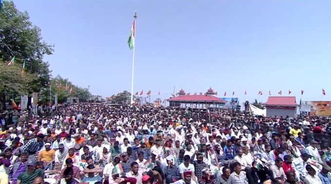 |शिमला। राष्ट्रीय जनतांत्रिक गठबंधन (राजग) के नेतृत्व वाली सरकार के आठ साल पूरे होने पर मंगलवार को प्रधानमंत्री नरेन्द्र मोदी शिमला के ऐतिहासिक रिज मैदान से केंद्र की 16 योजनाओं के लाभार्थियों से संवाद कर रहे हैं।शिमला का रिज मैदान लोगों से खचाखच भरा है, जहां मोदी-मोदी के नारे लग रहे हैं। यहां पहुंचने से पहले प्रधानमंत्री मोदी ने रोड-शो किया। उस दौरान स्थानीय लोगों ने पुष्प वर्षा कर उनका भव्य स्वागत किया।