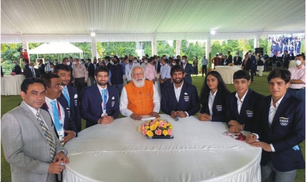 वहीं, बजरंग पुनिया ने कजाकिस्तान के दौलेट नियाजबेकोव को हराकर कांस्य पदक जीता। टोक्यो ओलंपिक में अपने अच्छे प्रदर्शन के लिए प्रधानमंत्री मोदी ने कार्यक्रम के दौरान बजरंग को पीठ पर थपथपाया। प्रधानमंत्री ने चोट से लड़ने के लिए बजरंग की भी सराहना की। बजरंग ने कहा, "मैंने डॉक्टरों से कहा कि पदक मेरे लिए महत्वपूर्ण है। मैं यहां स्वर्ण के लिए आया हूं। मैंने स्वर्ण नहीं जीता लेकिन पेरिस 2024 ओलंपिक में इसकी भरपाई जरूर करूंगा।"
