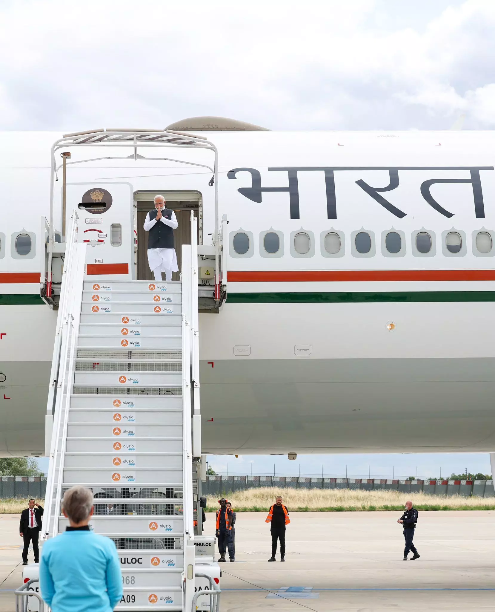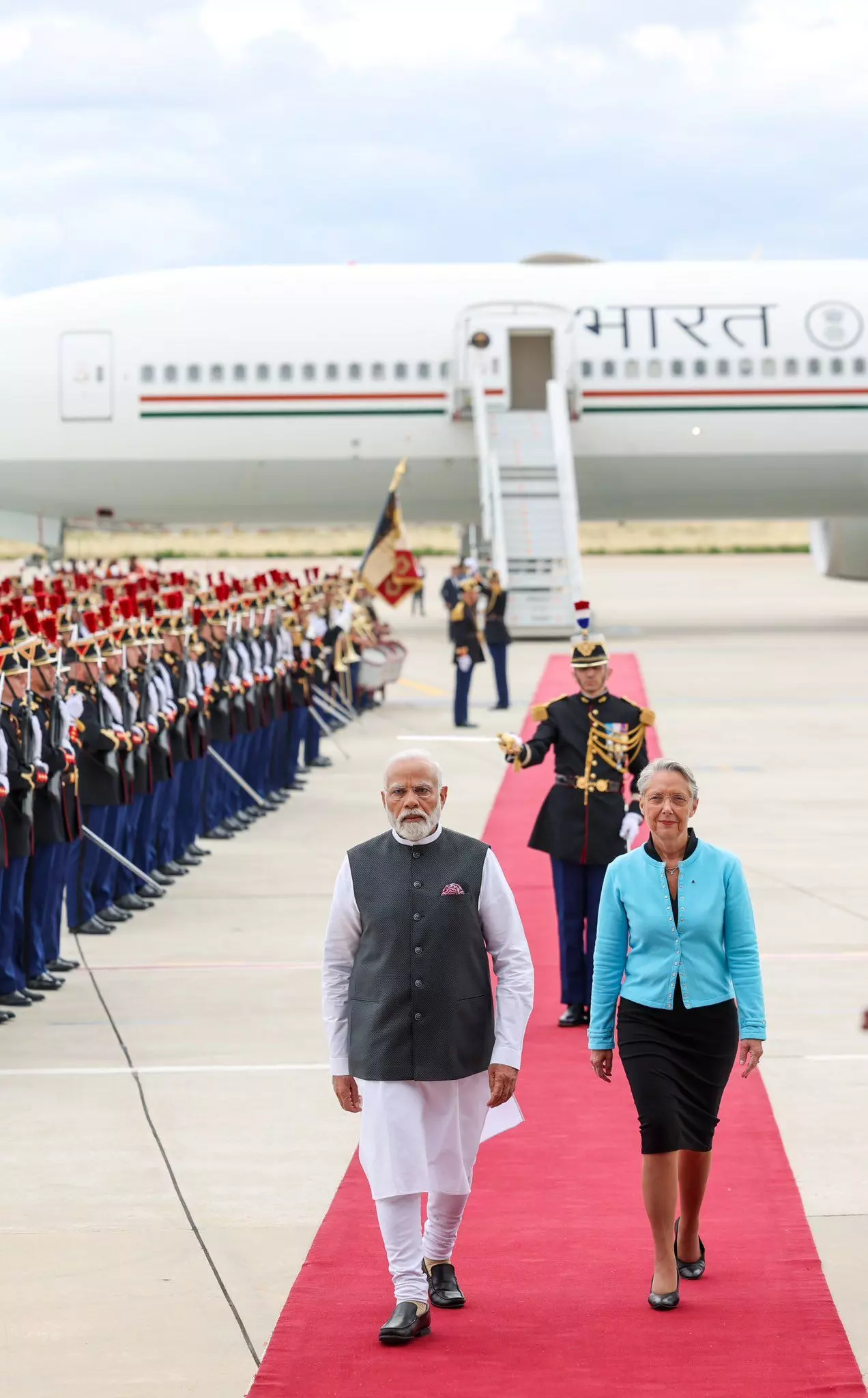 भारत के प्रधानमंत्री गुरुवार को तीन दिन के विदेश दौरे पर निकले हैं। वे दो दिन फ्रांस और एक दिन संयुक्त अरब अमीरात में रहेंगे। गुरुवार को फ्रांस पहुंचे भारतीय प्रधानमंत्री नरेन्द्र मोदी के स्वागत के लिए पेरिस के हवाई अड्डे पर फ्रांस की प्रधानमंत्री एलिजाबेथ बोर्न स्वयं पहुंची थीं। प्रधानमंत्री का हवाई जहाज पहुंचते ही फ्रांसीसी प्रधानमंत्री ने उनकी अगवानी की। इसके बाद उन्हें समारोहपूर्वक गार्ड ऑफ ऑनर दिया गया। हवाई अड्डे पर भारतीय प्रधानमंत्री के स्वागत में भारतीय राष्ट्रगान की धुन बजाई गयी। फ्रांस स्थित भारतीय दूतावास के अधिकारी भी हवाई अड्डे पर अपने प्रधानमंत्री के स्वागत के लिए पहुंचे थे।