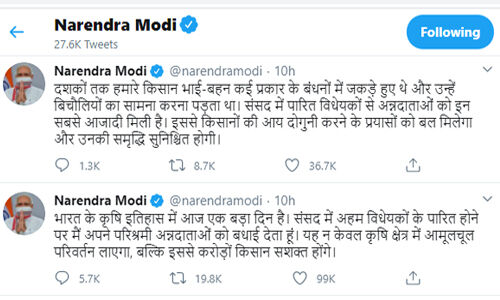 राज्यसभा में कृषि विधेयक पारित होने पर प्रधानमंत्री ने दी किसानों को बधाई