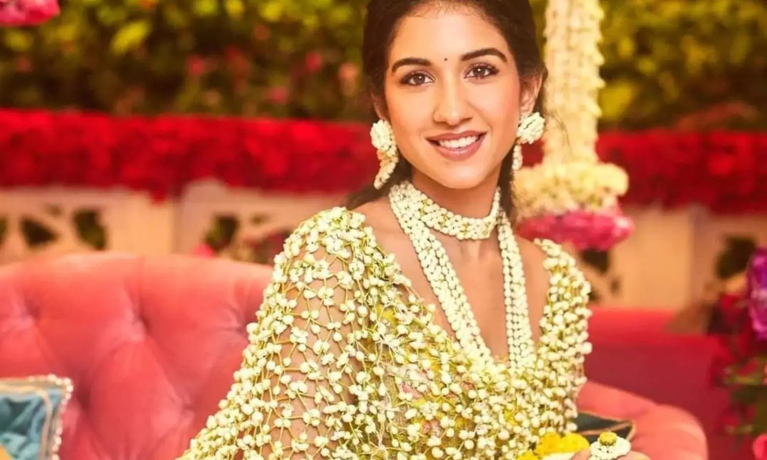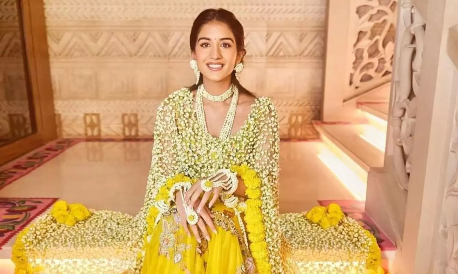 आपको बताते चलें कि, अनंत अंबानी की दुल्हनिया राधिका के हल्दी सेरेमनी फंक्शन के लिए सेलिब्रिटी फैशन स्टाइलिश रिया कपूर और फैशन डिजाइनर अनामिका खन्ना के डिजाइन ने 90 किलो की गेंदे के फूल के साथ राधिका के लिए यह स्पेशल दुपट्टा तैयार किया था। दुपट्टे के अलावा अपनी ज्वेलरी भी ताजी सफेद तगार कलीरियों की ही पहनी थी उनके गले में लंबा हार, झुमके, लटकन डोरियों से सजे टॉप, एक डबल हार, हाथ फूल शामिल हैं, जो सब ताजा फूलों से बनी थी।