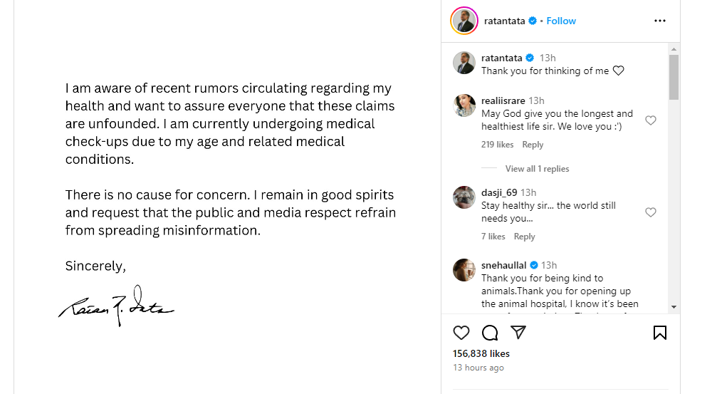रतन टाटा ने अपने सोशल मीडिया पर उन सभी रिपोर्टों का खंडन किया जिनमें दावा किया गया था कि उनकी स्वास्थ्य स्थिति गंभीर है और कहा कि वह उम्र और संबंधित चिकित्सा स्थितियों के कारण चिकित्सा जांच करवा रहे हैं।