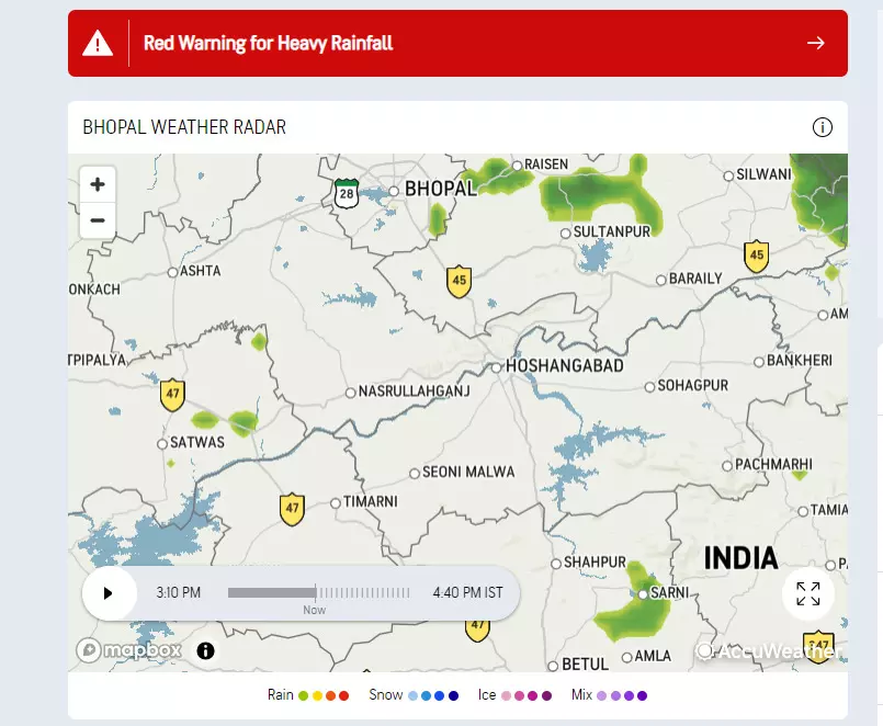 सीहोर, रायसेन, नर्मदापुरम, नरसिंहपुर, छिंदवाड़ा, सिवनी, मंडला, बालाघाट, डिंडोरी, अनूपपुर, श्योपुर और शिवपुरी में बहुत भारी बारिश का रेड अलर्ट है।
