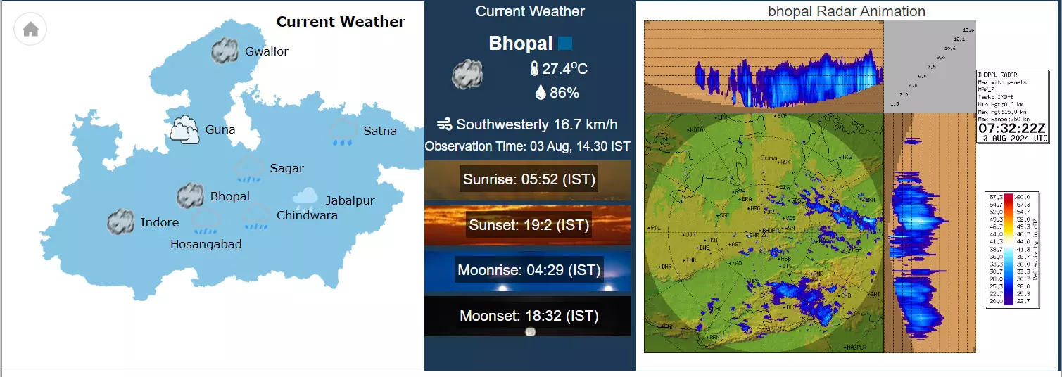 August 3 Weather Update: भोपाल। मध्य प्रदेश की राजधानी भोपाल में शनिवार को भी बारिश जारी है। 12 जिलों में भारी बारिश का रेड अलर्ट जारी किया गया है। वहीं, भोपाल और जबलपुर समेत 23 जिलों में भारी बारिश का ऑरेंज अलर्ट जारी किया गया है। वहीं इंदौर में भी सुबह से ही हल्की बारिश हो रही है।